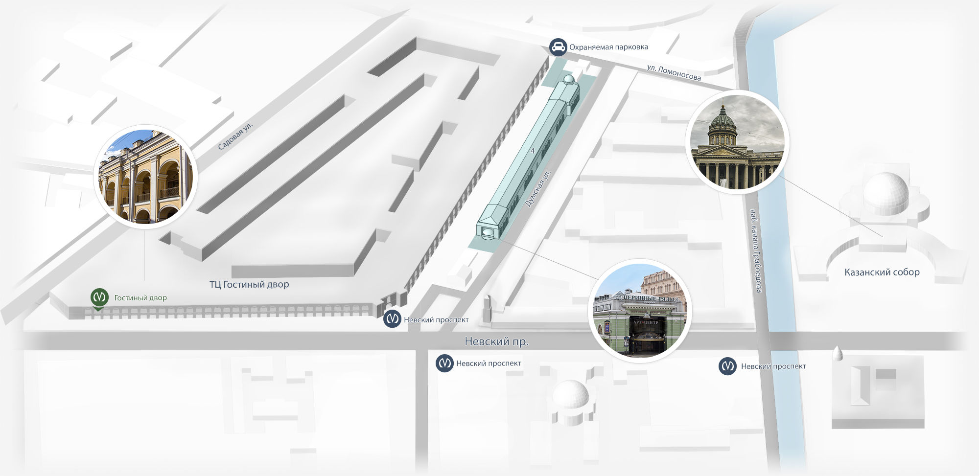 Здание примыкает к Невскому проспекту, по которому пролегают основные маршруты туристов и